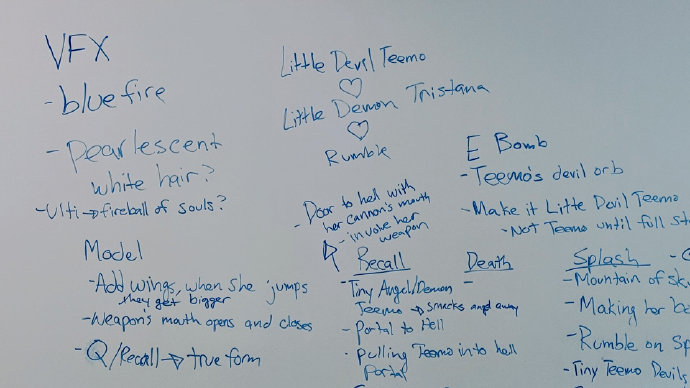 这是蓝天会议的白板。上面的内容有可能最终一项都无法入选 – 毕竟只是早期的头脑风暴!接下来我们会测试一些我们喜欢,但不确定游戏内效果的想法。有时候会有特别棒的2D概念图,但在游戏内表现却不行的情况。作为产品经理,我会对最终的皮肤负责,所以这意味着决定最终加入哪些功能是我工作的一部分(以及砍掉哪些功能)。我通过团队、美术和制作负责人、交付负责人、工程团队、市场以及任何合伙团队(比如全球总决赛冠军皮肤中的冠军战队)的直接反馈协助我做出决定。我们通常从蓝天会议开始探索点子。
