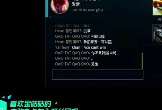 具体的聊天记录如下,在韩服rank的时候,doinb刚好排到了几位国内玩家,国内玩家也认出了他,其中有一位玩家直接用Khan之前的嘲讽话询问doinb:五个CN不能赢,Khan说的。doinb看到之后非常机智的反驳:他说的是四个,没事,我们是五个CN,可以赢。这句话一出,立马引发了其他国内玩家在聊天室的热议:doinb你不是韩国人吗?兄弟?
