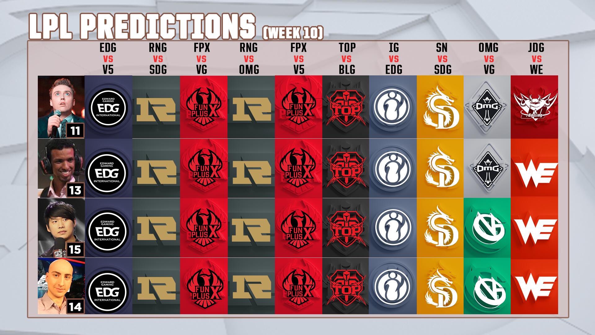 JDG 对 WE:Hysterics一人预测JDG胜,其他解说全部预测WE胜。