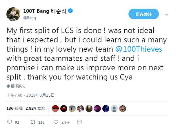 伴随着北美常规赛结束,Bang和他的100T也以北美最后一名完成了这一阶段的比赛。Bang也成为了100T战队中,唯一一名打完了全部常规赛阶段比赛的选手。伴随着春季常规赛正式落下帷幕,Bang发推总结了自己的第一个北美赛季经历。