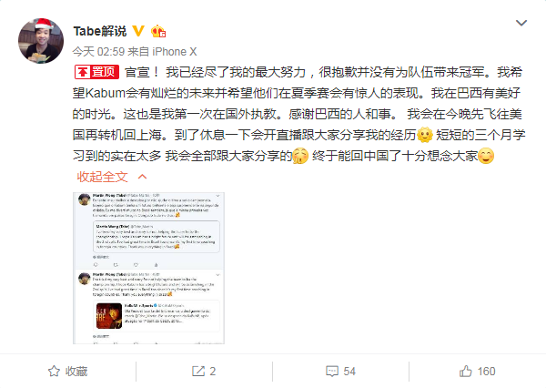 官宣! 我已经尽了我的最大努力,很抱歉并没有为队伍带来冠军。我希望Kabum会有灿烂的未来并希望他们在夏季赛会有惊人的表现。我在巴西有美好的时光。这也是我第一次在国外执教。感谢巴西的人和事。 我会在今晚先飞往美国再转机回上海。到了休息一下会开直播跟大家分享我的经历。 短短的三个月学习到的实在太多 我会全部跟大家分享的。 终于能回中国了,十分想念大家!