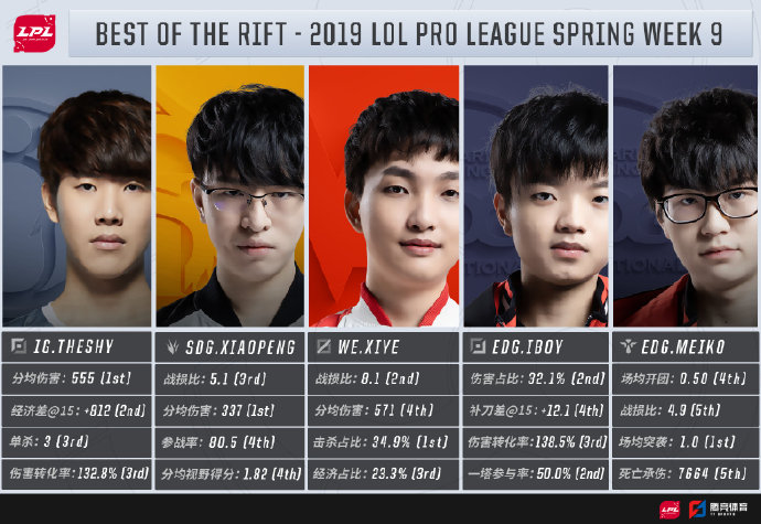 LPL春季赛第9周最佳阵容:Xiye首次入选 EDG下路登榜