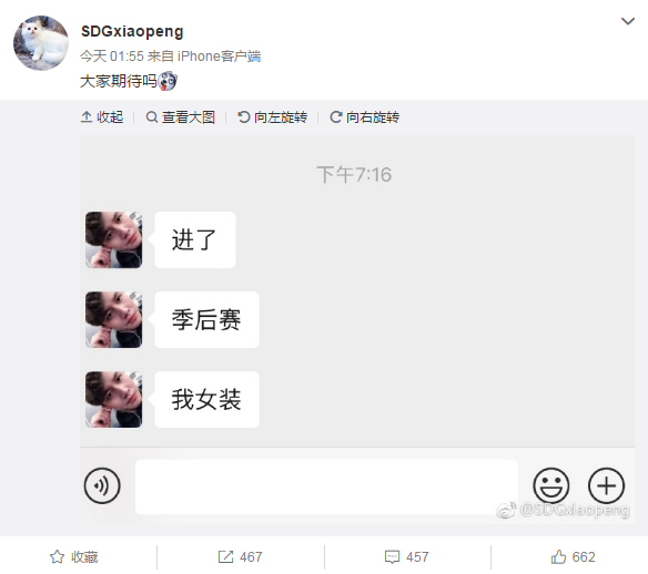 相信大家对于女装这个词可谓是一点都不陌生,肯定记得真正的“女装大佬”AJ可谓是刷新了LOL玩家们的审美,但是就在北京时间今日凌晨,SDG战队打野选手Xiaopeng发微博晒出一张聊天记录图,内容是自己队内的辅助选手的“骚话”:“进了季后赛我女装”