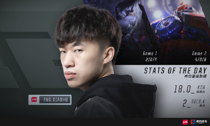 昨日的最佳数据荣誉属于RNG的中路选手Xiaohu!