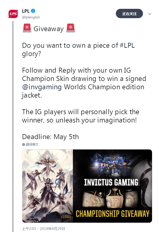 在IG冠军皮肤全球上架后,获得了全球大量玩家的热情追捧,就在北京时间今日,LPL官方推特举办了一个“iG冠军皮肤手绘”活动,优胜者将可获得一件iG全队签名夹克外套。