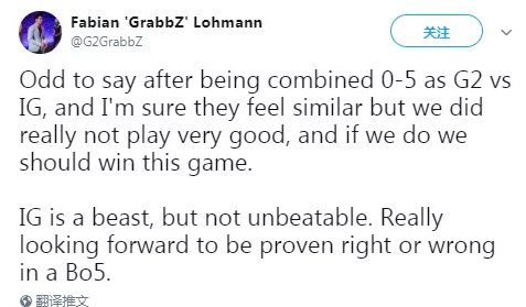 在G2被IG打了个0-5之后感觉很奇怪,我觉得他们已经能触碰到了赢回一局的边缘,但事实上我们打得是真的不好。如果我们能够保持信心,我相信我们可以赢下比赛的。