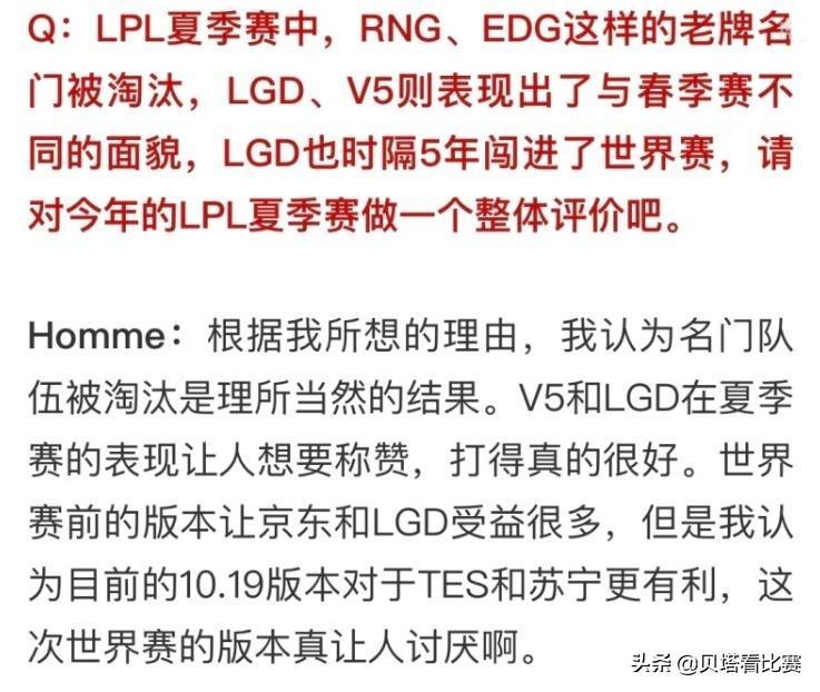 详细说到了10.19的版本问题,红米的回应如下图所示,他非常直接地在记者面前表示世界赛前的版本让JDG和LGD受益很多,但是世界赛10.19的版本对于TES和SN更有利。最后红米教练还也再次强调:这次世界赛版本真的让人很讨厌。