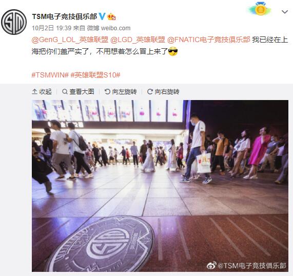 TSM官博喊话C组:“@GenG_LOL_英雄联盟 @LGD_英雄联盟 @FNATIC电子竞技俱乐部 我已经在上海把你们盖严实了,不用想着怎么冒上来了”