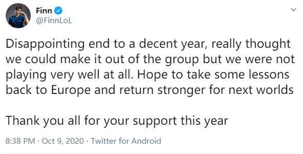 昨日赛后RGE上单Finn更文:令人失望的一年结束了,我们真的以为我们能从小组赛突围,但是我们并没有打好。希望能把一些经验带回欧洲,下次世界赛变得更强。感谢大家今年的支持。