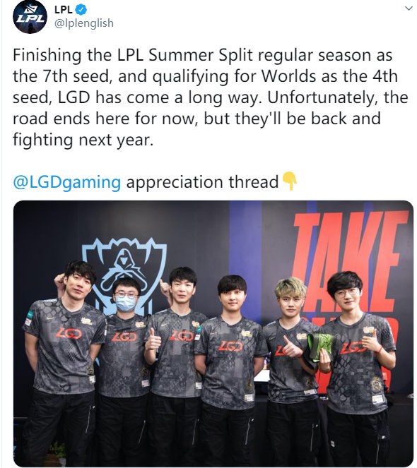 LPL官方英文流更推:完成了从夏季赛常规赛第七名到世界赛四号种子的蜕变,LGD已经取得了很大的进步。遗憾的是,世界赛之旅暂时结束了,但是明年他们会再度回归战斗。