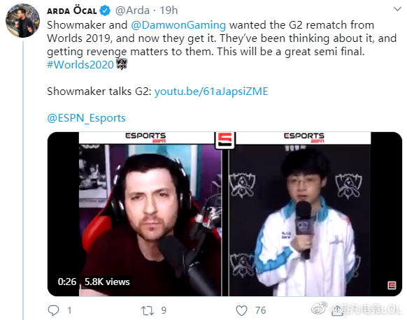 昨日G2 3-0战胜GEN成功晋级半决赛以后,ESPN记者Arda更推:“ShowMaker和DWG在2019年世界赛后一直想要交手G2,现在他们的愿望实现了!他们一直都在想这件事,报仇对于他们来说都是非常重要的。这将会是一场很精彩的半决赛!”