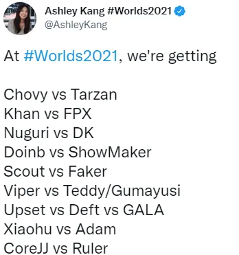 外媒在推特上盘点了2021全球总决赛可以看见的各种焦点对阵: