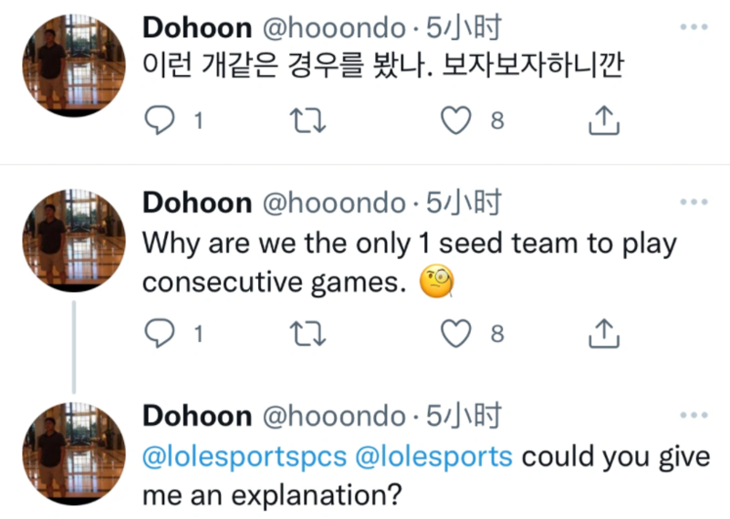 “为什么我们是唯一一支需要连续打两把的一号种子?拳头你能给我一个解释吗?我一看见赛程就觉得跟吃x了一样。”