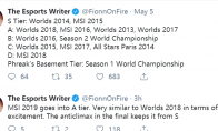 在之前MSI开打的时候ESPN就已经给之前的所有的大赛评过等级了,等级顺序分为S、A、B、C、D。时隔半个月之后,2019MSI也已经结束了,冠军由欧洲赛区的G2夺得,而FionnOnFire也再次在推特上给这届MSI打了一个分,认为这届MSI达到了A级。推特