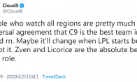 在C9战队取得LCS联赛春季赛10连胜后,C9赛后发推谈及C9与LPL联赛:大家几乎都认同目前C9是世界第一。也许LPL开赛后会有所改变,但我对此表示怀疑。Zven和Licorice在他们的位置上绝对是最强的。