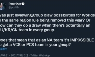 今日LCS赛区EG战队教练组负责人Peter Dun发推质疑拳头的抽签分池情况可能会导致抽签结果和抽签规则(来自同一个赛区的队伍不能分在一个小组) 只是在考虑世界赛分组抽签的可能性,现在是否还有同一个赛区的队伍不能分在一个小组的限制?或者说,当每个组都必须有一