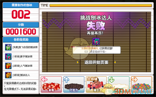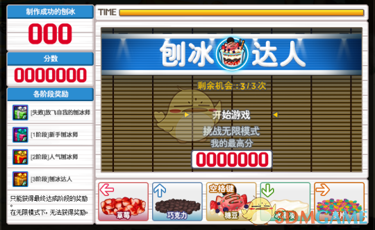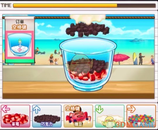 2、秀儿亲自参与了刨冰活动,其规则和以前的“制作汉堡”类似,系统给出要制作的刨冰图样,我们用方向键和空格键选择材料制作,要求在规定时间内完成3个阶段的制作。