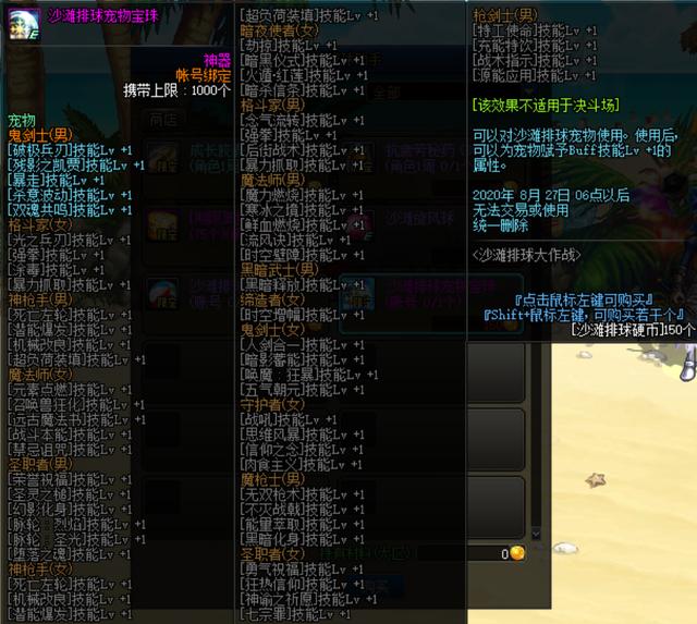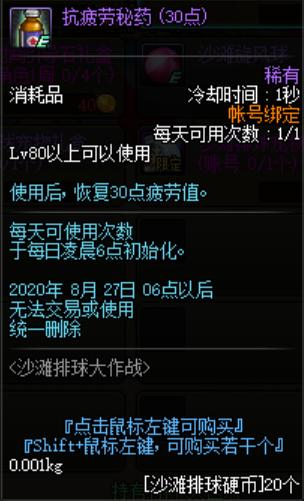 DNF沙滩排球硬币可以在沙滩排球助手NPC的商店兑换奖励,30个兑换1个30%的经验胶囊,每周每个角色三次,20个兑换30点疲劳药,每周每个角色1次,40个兑换75个时间引导石,每周每个角色4次。
