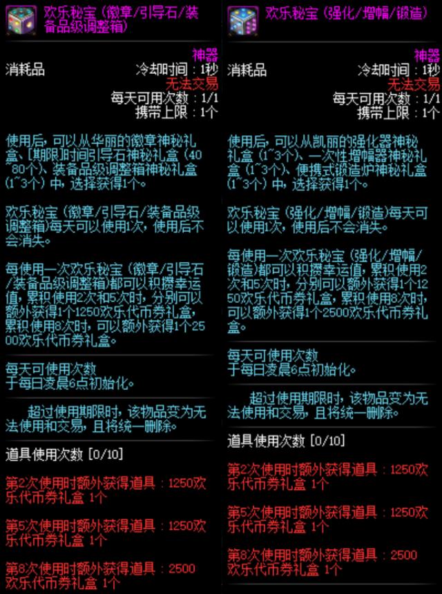 DNF欢乐秘宝需要在商城购买,礼盒每天只能打开一次,也就是最少需要8天的时间玩家才能拿到全部的欢乐代币券奖励,如果是需要购买商城道具玩家,这一秘宝是非常是非常的划得来。