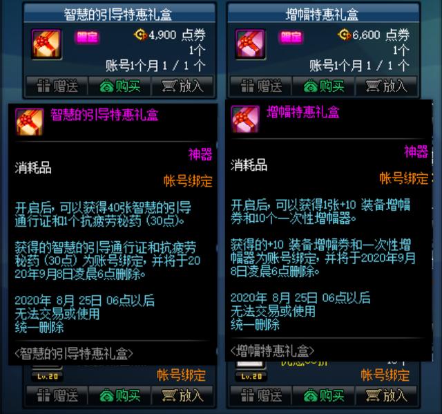 7.30版本的商城更新中新增了2个特惠礼盒,一个是4900点券的智慧的引导通行证特惠礼盒和6600点券增幅特惠礼盒,而深渊票活动都有送,这一个礼盒相当于1块钱一把深渊,并不是很划算,但是增幅礼盒就很划算了,这一个礼盒是可以使用代币券购买的,所以玩家只要领到全部的欢乐代币券就能购买这一个礼盒。