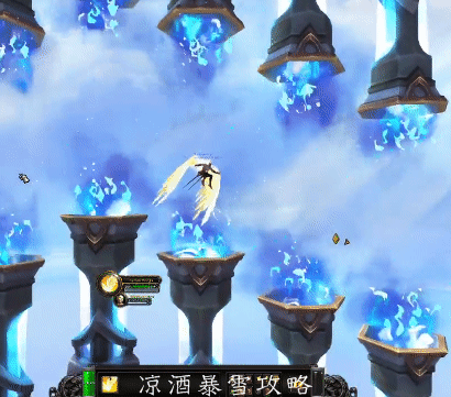 而9.0这个新的世界任务的玩法和flappybird基本相同,按1键位那个技能就是让角色往上飞一点点,不按就会因为重力向下坠落,玩家需要通过这些变形的水管的空隙: