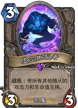 炉石传说狗头人与地下世界中立新卡——虚空撕裂者(暂译),3费3-3,恶魔,战吼:使所有其他随从的攻击力和生命值互换。