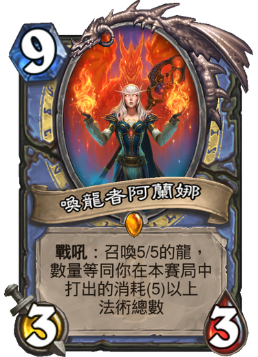 战吼:本局游戏中你每施放一个法力值消耗为(5)或(5)以上的法术,就召唤一个5/5的巨龙。