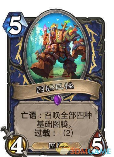 而另一张则是5费的图腾巨怪,这张卡虽然有着过载两费的缺陷,但是却是一张会让对手两难的生物:你既要担心天梯映像生出两个,还要提防一地的图腾配合各种buff一回合把你秒了。可以说是这个卡组后期的赢点之一,不过缺点就是比较怕沉默和变形一类的法术,对读对手牌的能力要求比较高。