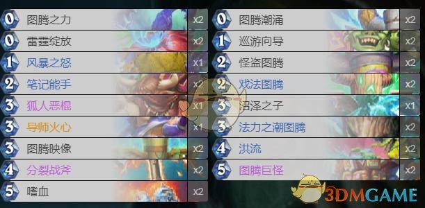 1费的新中立卡巡游向导是一张不可多得的好卡,让这套卡组前期摇图腾给场面压力变得十分顺滑,而且也是这套卡组中唯一可以下的怪(卡位实在太紧)。而雷霆绽放就无需多言,对于中期展开和后期收割都有着非常强的补费用作用,但是用的时候也是要谨慎,要么超展开压死,要么确保对手能够被击杀,不然会亏非常多的节奏。