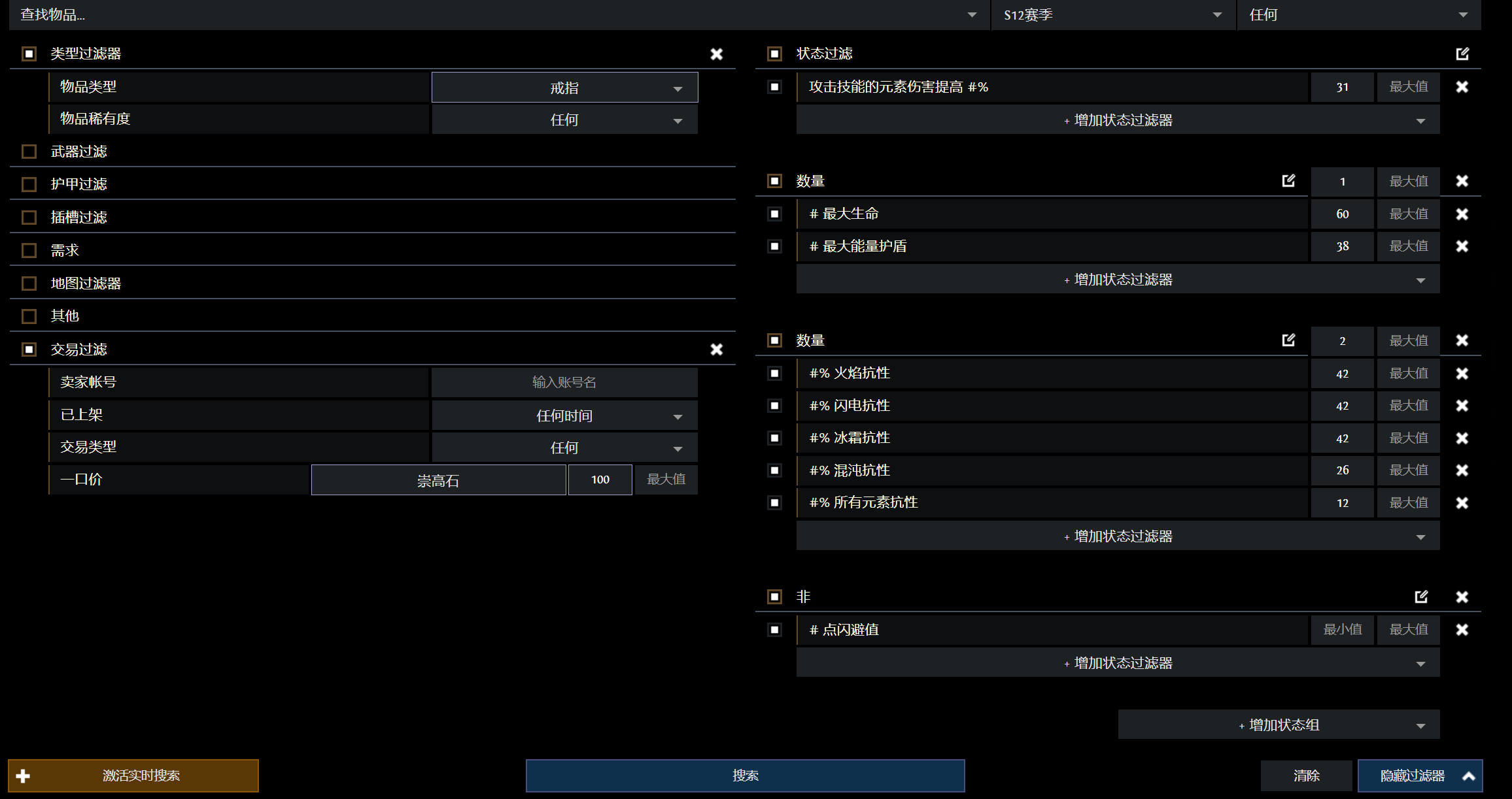 举例:找一个戒指,至少T2攻击技能的元素伤害提高 T2生命或者T2护盾 两个T2抗性,不能有闪避,少于100E的垃圾就是侮辱我怎么搜???