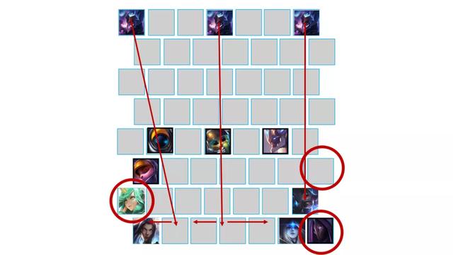 这就导致棋盘会有三个往里凹陷最佳C位防守位置,当所有人不动时,刺客是没有办法直接切到的位置,这个位置不绝对,当刺客过多或者单位出现走动的时候会有不一样的变化。