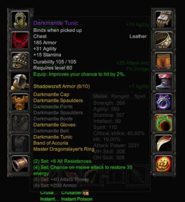 根据模拟测试的效果,安其拉阶段时,盗贼的BIS搭配就变成了这样:暗幕4件选择头、腕、手、鞋,T2.5选择肩膀、胸甲和护腿,配一件克苏恩的腰带。其余部位根据自己的需求来,武器同理。由于暗幕4件的回能效果,为盗贼带来的不止是技能释放量增多,更是可以改变玩家的手感,可说是60年代终极配装,每一个追求输出的盗贼都应该准备好。更何况,目前迅影刷起来还是很简单的,不像以前需要各种竞争。也有玩家认为用4暗幕就要优先暴击攻强,牺牲命中,因为暗幕套增加的是能量获取,受强度暴击加成而不受命中加成。