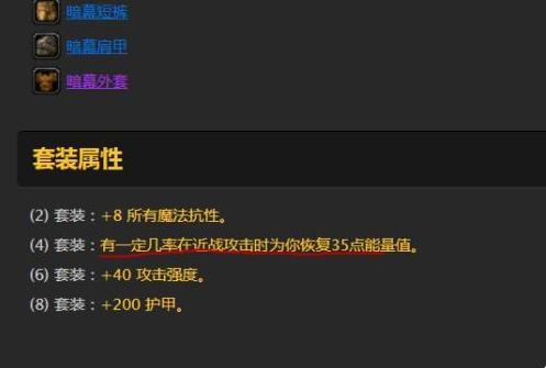 我们可以先来看看近一点的内容,也就是下个阶段的T2.5套装。盗贼T2.5的属性主要是力敏耐,辅以少量命中暴击。以它们的胸甲属性来对比,死亡执行者套的胸甲有37敏捷1命中1暴击,暗幕胸甲是31敏捷2命中,提升十分有限。然而,T2.5套装的效果,3件可以减少闪避CD,对PVE完全无用,5件才能增加剔骨15%伤害,对输出提升也相对轻微。T0.5则不同,4件套即可触发几率回能的效果,比升级前的迅影套给力多了。经过模拟测试,战匕T0.5+3T2+暗影烈焰+死钉,输出能力远强于5T2.5+其拉死刑护腕+强制者手套+小克腰带+死钉。