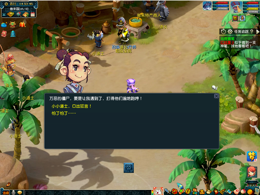 特色投放怪。中元节期间,阴气弥漫,小鬼横行。每到30分,总有一队小僵尸偷偷摸摸地爬出坟墓,肆无忌惮地在三界游荡。茅山子弟和三界的正义之士均可前往降服。若能打败僵尸头头,也是头功一件呢!