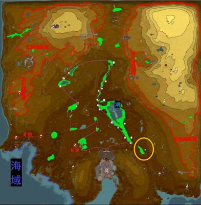 橙色星号是深水湖区钓鱼点,虽然是只有一个大湖,但是标记点是水里经常冒泡泡的地方。深水湖区刷新的鱼类有黑电鰻、颌鱼、冠触。