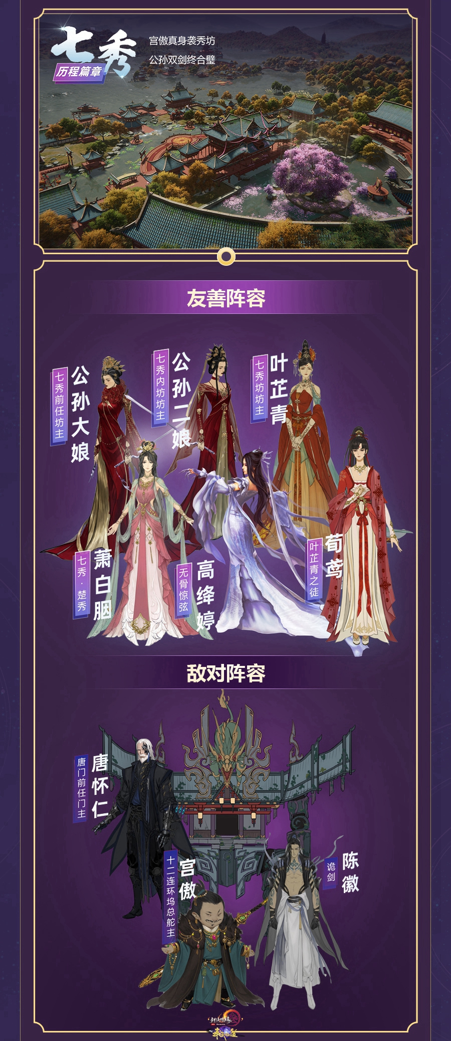 而宫傲在高手相助下,带领十二连环坞部众急袭七秀坊,迫使公孙大娘、二娘双剑合璧,江海凝波剑与山河流云剑再现江湖……