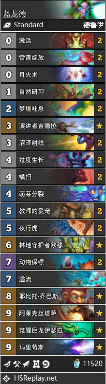 蓝龙德的标准构筑与补丁前相比并没有什么变化,这一构筑在对阵炸弹战,牧师和法师时表现良好。另一种构筑思路是由Orange提出的,将原本构筑中的自然研习和沼泽射线换成了水晶之力和阿努比萨斯防御者。这个调整的目的主要是为了应对快攻,特别是针对快攻贼。既然要带阿努比萨斯,那就必须舍弃乔巴斯,同时满编溢流。乔巴斯在对阵慢速卡组时非常强力,所以这样的调整本质上就是砍长板补短板。