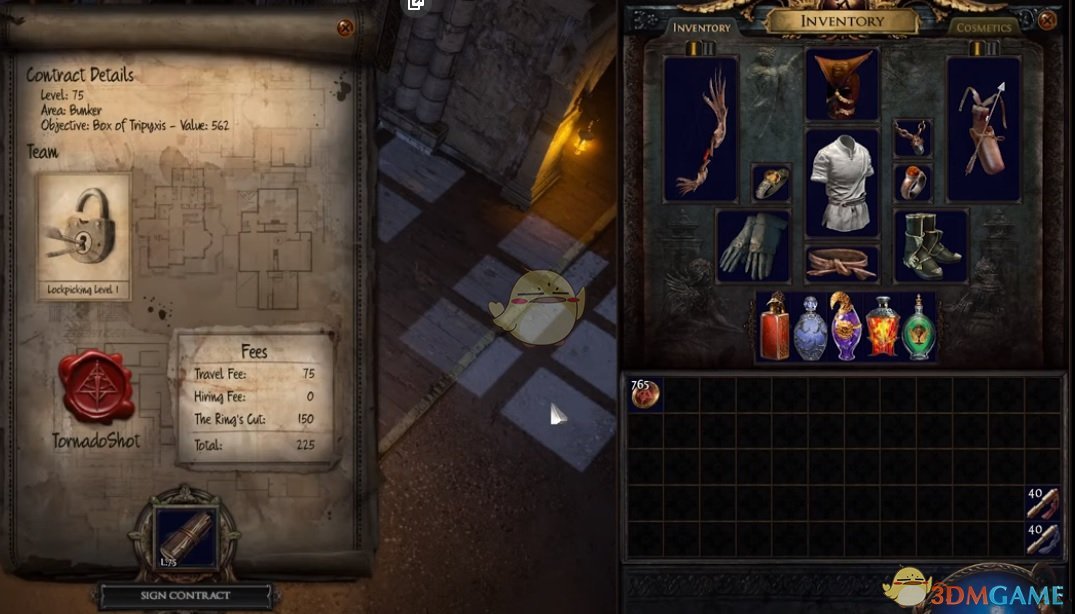使用契约后,会进行契约内容确认。第一张图上,区域等级75,劫盗目标一箱Tripyxis并奖励562劫盗印记。点击契约上的技能需求,可以选择适合的NPC,如图2可以在两个NPC都会开锁选一个。必须符合最低需求才能接受契约。额外NPC会消耗劫盗印记。