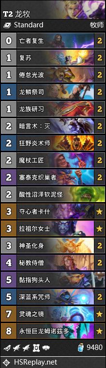 龙牧是落寞的旧日王者,这一卡组在面对越来越少的盗贼和内战情况下,秘教暗影祭司不再重要,所以我们把这一单卡换成了能够一定程度针对DH的2+5双软,因为难以针对德鲁伊,这一卡组在下周势必继续滑落