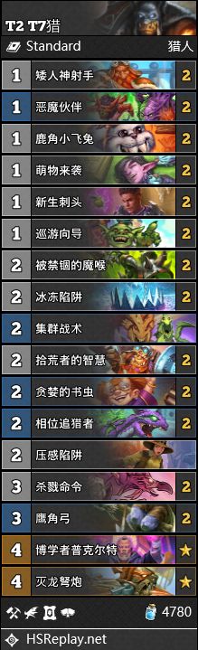 T7猎在当下的环境中生存环境并不好面对除了保镖德以外的主要卡组都不能以优势对局而存在,这一卡组在残片DH慢慢占据天梯顶端的当下,下周会继续滑落已成定局,在奥秘选择上,我们选择了集群+压感+2冰冻的配置,这样的配置一方面让对方难以猜奥秘,另一方面也能有效地克制保镖德,在德鲁伊较多的中低分段和贫民玩家手中,T7猎依然是廉价上分之选