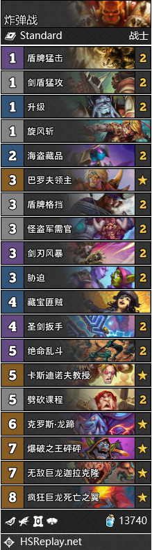 炸弹战的取胜策略简单粗暴。只要你给他足够的时间来埋炸弹,他所能制造的伤害就不容小觑。但如果你能早早施压,不让他舒服打脸,那么炸弹战的威慑力也会大减。近来由于快攻贼热度锐减,快攻卡组的整体数量也有明显减少,这对炸弹战来说无疑是一个好消息。结合前面的分析,你应该已经能够猜到:舍弃艇长+铸剑师的炸弹战是天梯上的最优构筑而且领先优势相当明显。双乱斗在如今的环境中必不可少,所以我们没有对构筑做出任何修改。当然,如果你有软泥恐惧症,那么也可以考虑满编藏宝匪贼。但总的来说这并不应该,因为小软其实是一张很糟糕的针对卡。