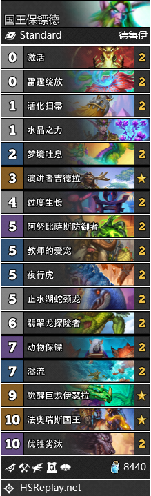 国王保镖德的表现则更加平稳。这个构筑不仅在慢速对局中能够制造足量的威胁,而且也有能力抵御快攻卡组的攻势。你可以认为这就是一个“万金油”构筑。我们发现构筑的最优选择是携带六只野兽,以求最大化动物保镖的功效。这样就算第二张保镖打出较晚,一般也能拉满两只。因为构筑中带有两张优胜劣汰,所以有的时候用保镖拉出两只大个野兽就可以直接赢得对局。为了满编野兽,我们减少了一张水晶之力。现在因为快攻贼减少,水晶之力也不像过去那样有用了。