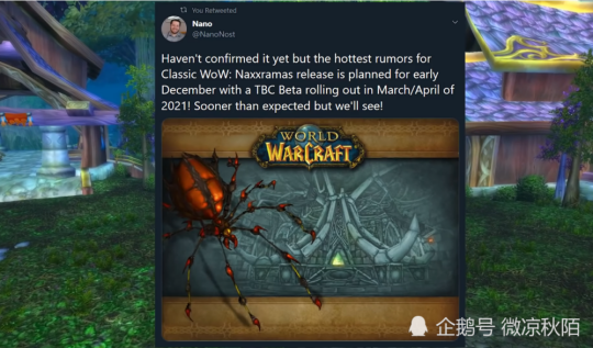 在9号的时候,N服也就是在暴雪60怀旧版上线后关闭的SF,前团队成员Nano曾经发布过一则关于TBC怀旧版的消息。Nano称据可靠的消息来源,暴雪会在12月份上线60版本怀旧服的第六阶段,并且会在3月份或者4月份上线TBC怀旧服的Beta版本,也就是测试版本。因为是N服的团队,暴雪也因60版本怀旧服而产生过跟N服团队合作的意向,所以这消息被不少玩家认为具有较高的可信度。