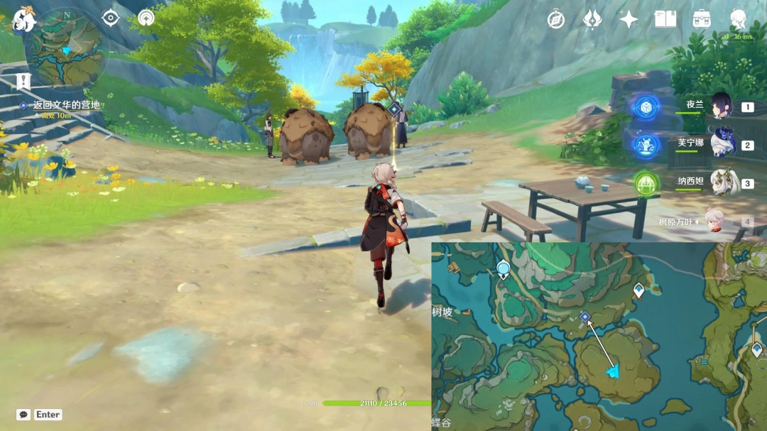 往地图的西北方向走,返回营地
