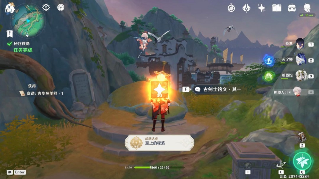 对话结束,完成任务「秘谷侠隐」,获得成就「至上的秘笈」,获得食谱:古华鱼羊鲜