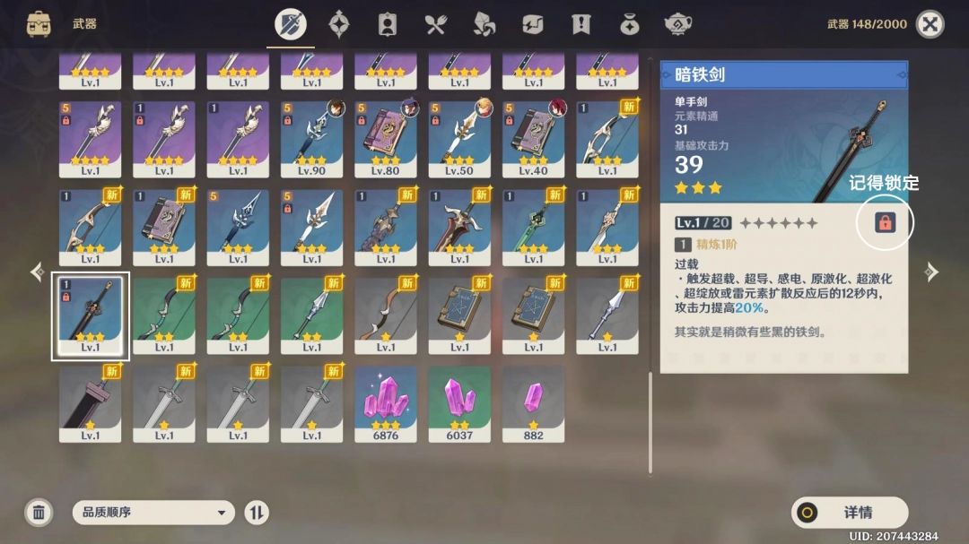 打开背包-武器,记得锁定暗铁剑