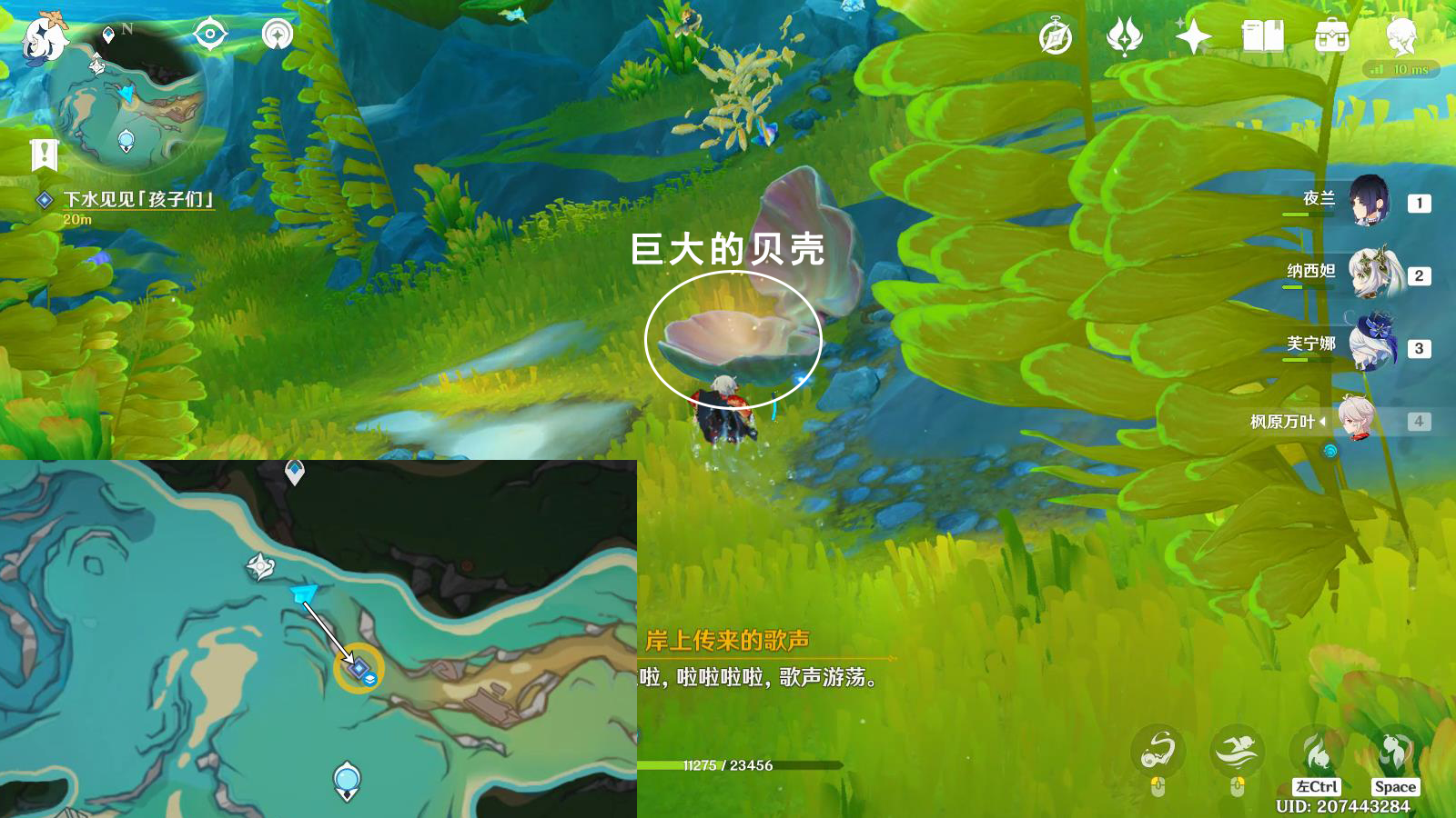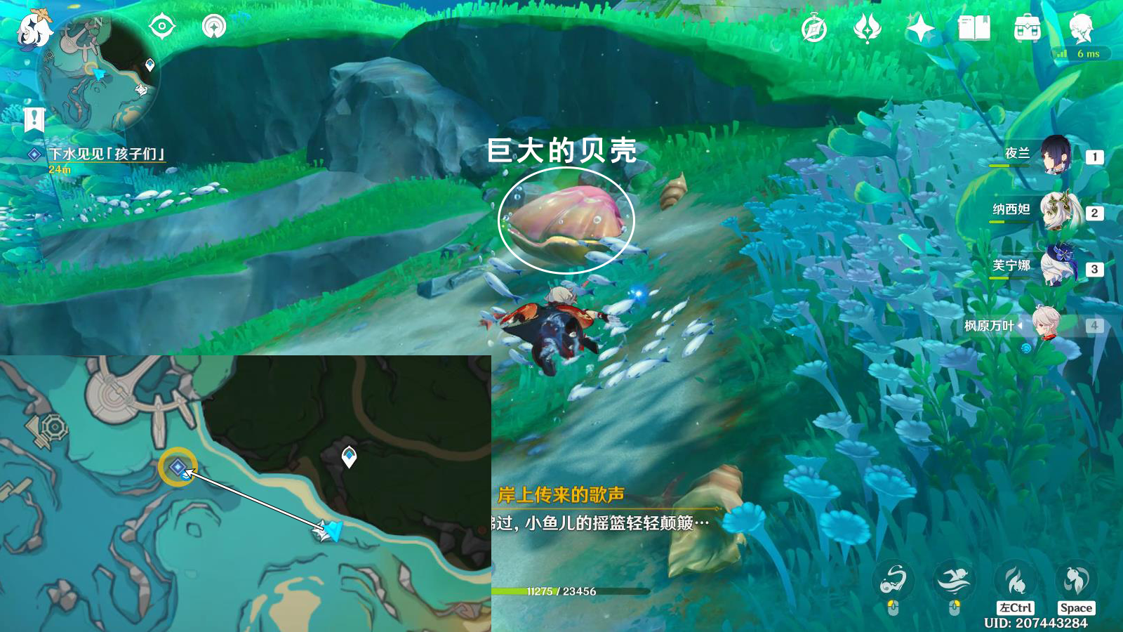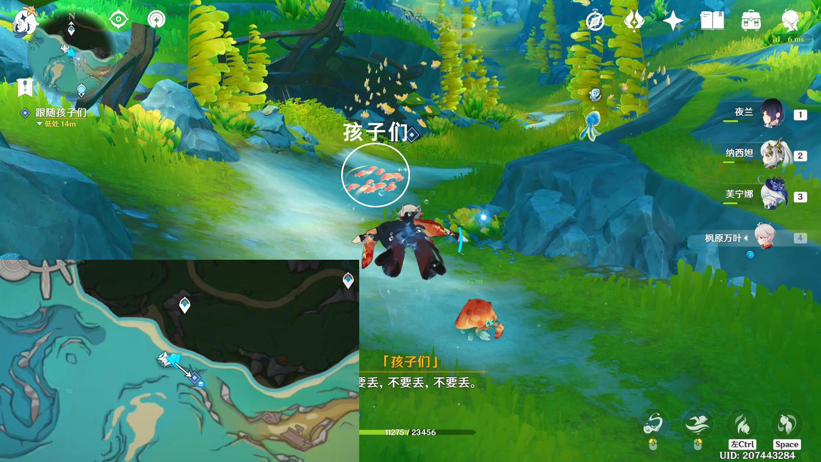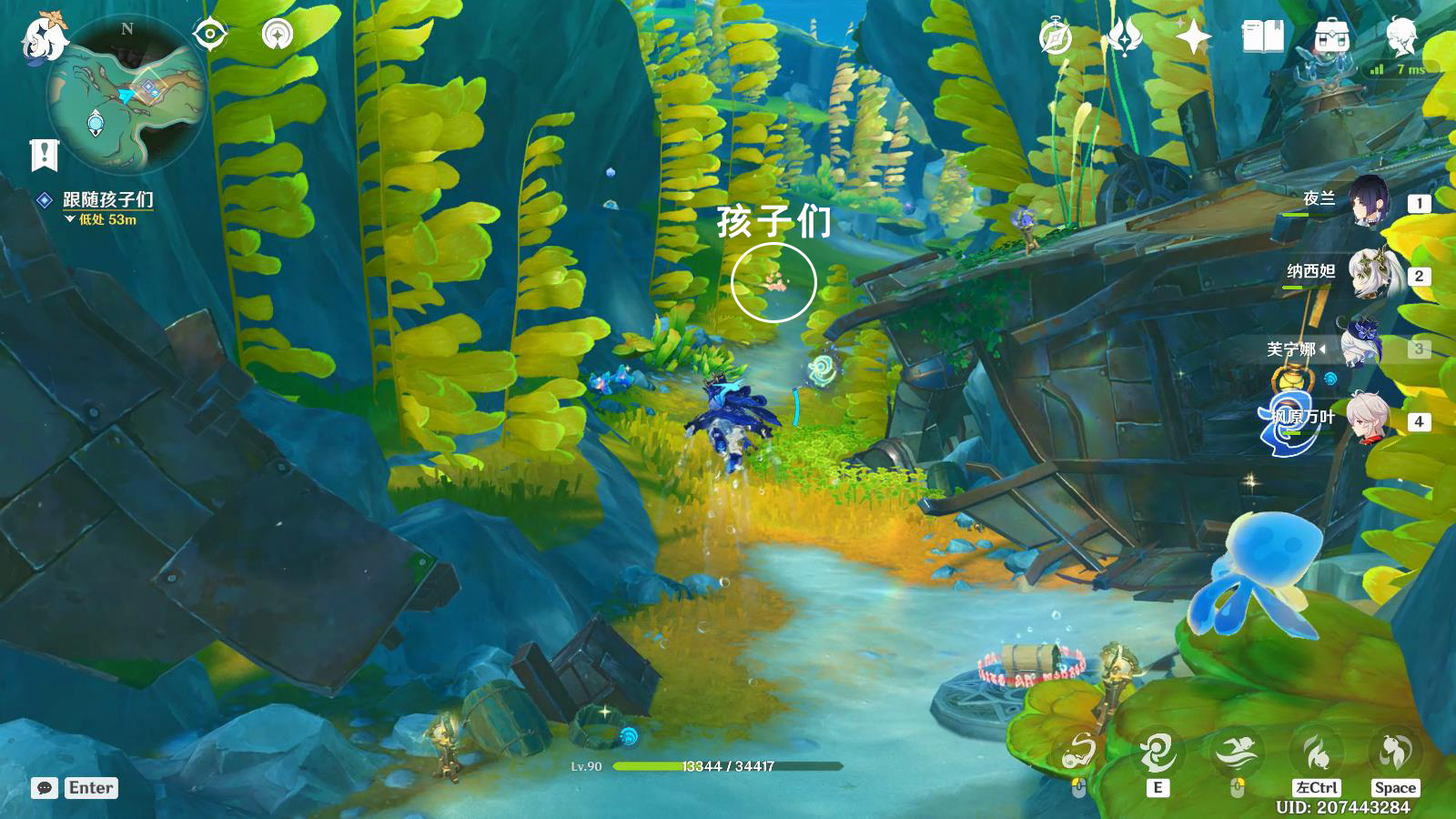 往地图的东南方向游,跟随孩子们,进入水环加速游