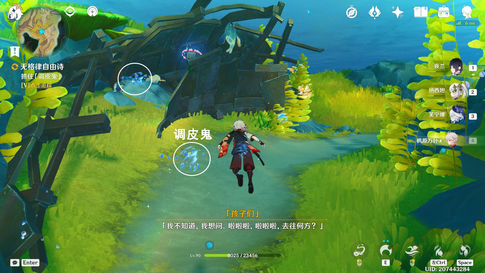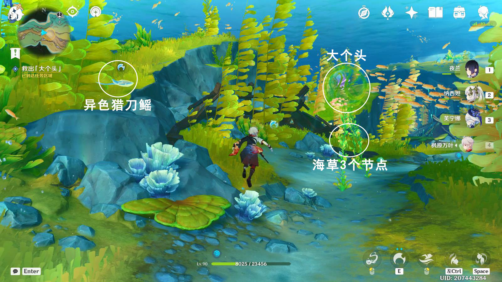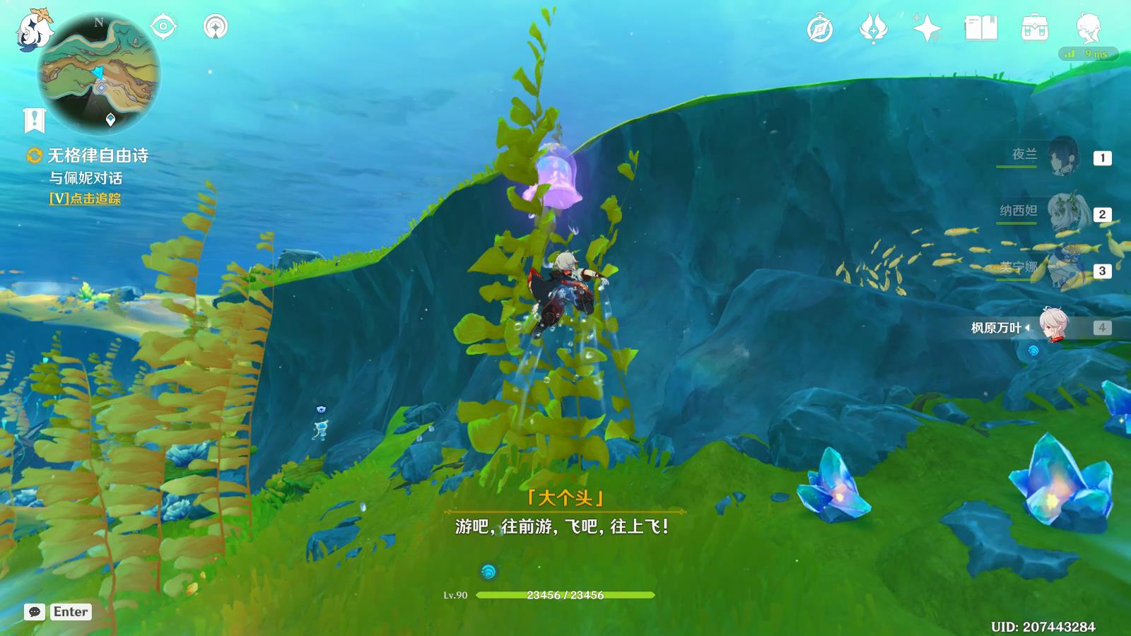往地图的东南方向游,跟随孩子们,进入水环加速游