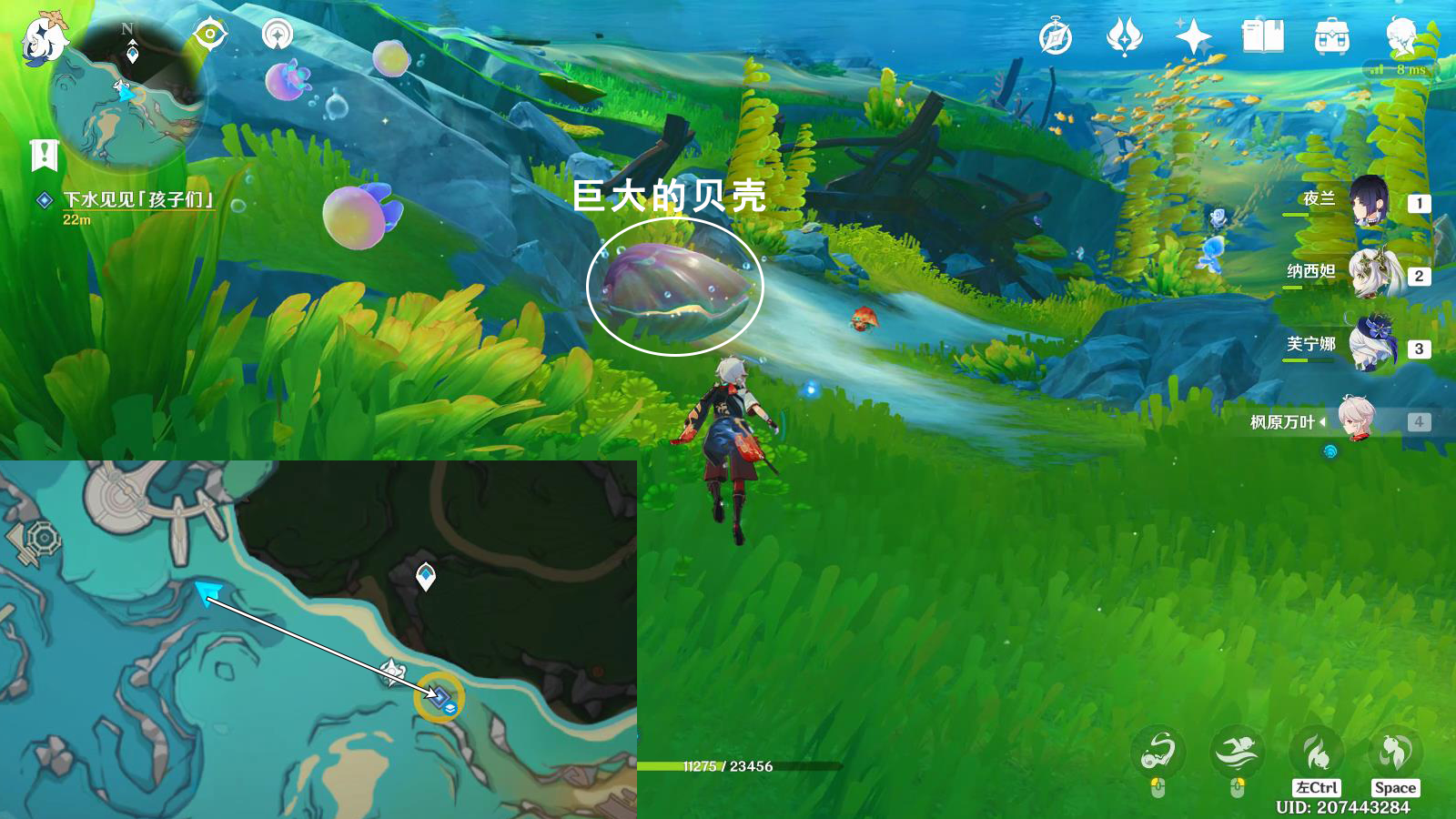 往地图的东南方向游,攻击1下巨大的贝壳,进入贝壳内