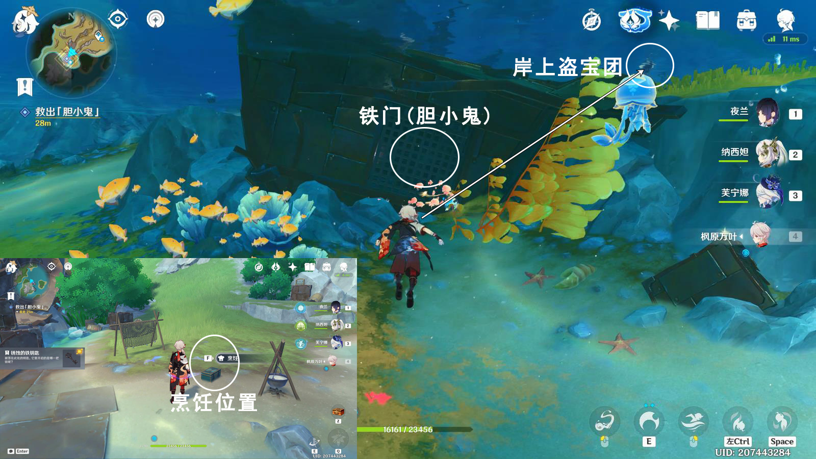 击败岸上盗宝团,在烹饪位置,拾取锈蚀的铁钥匙
